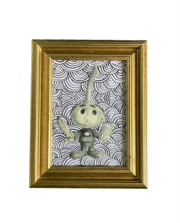 Mooi uitgesneden reproductie in vintage lijst met glasplaatje. De print is een afbeelding van een onderzeediertje waarvan het origineel getekend met grafietpotlood. De achtergrond is voorzien van een printje in zwart/wit.