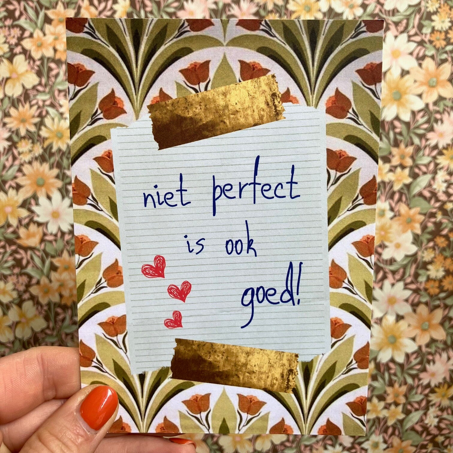 Leuke postkaart met de tekst "Niet perfect is ook goed". De kaart met een vintage behangetje als achtergrond heeft een matte uitstraling.A6 formaat400 grams ongestreken papier