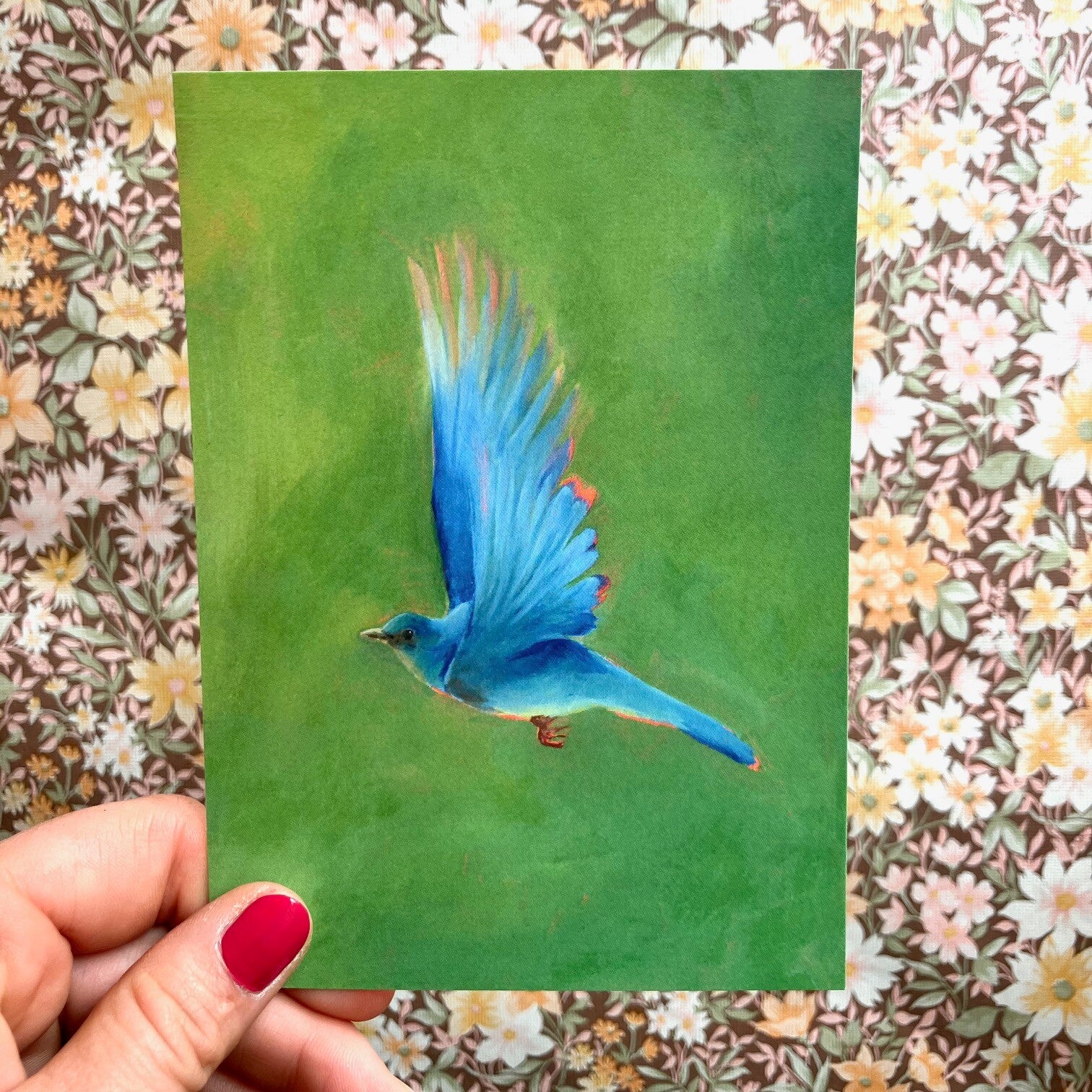 Mooie postkaart in matte uitvoering. De kaart heeft als afbeelding een met olieverf geschilderde bluebird.