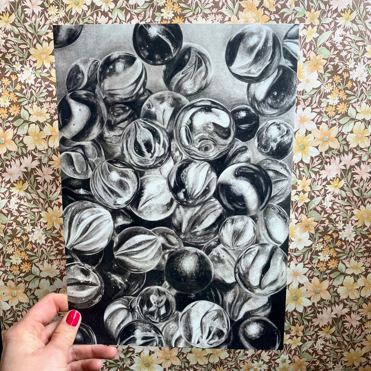 Mooie reproductie met matte afwerking. De print is een afbeelding van knikkers waarvan het origineel getekend is met grafietpotlood.