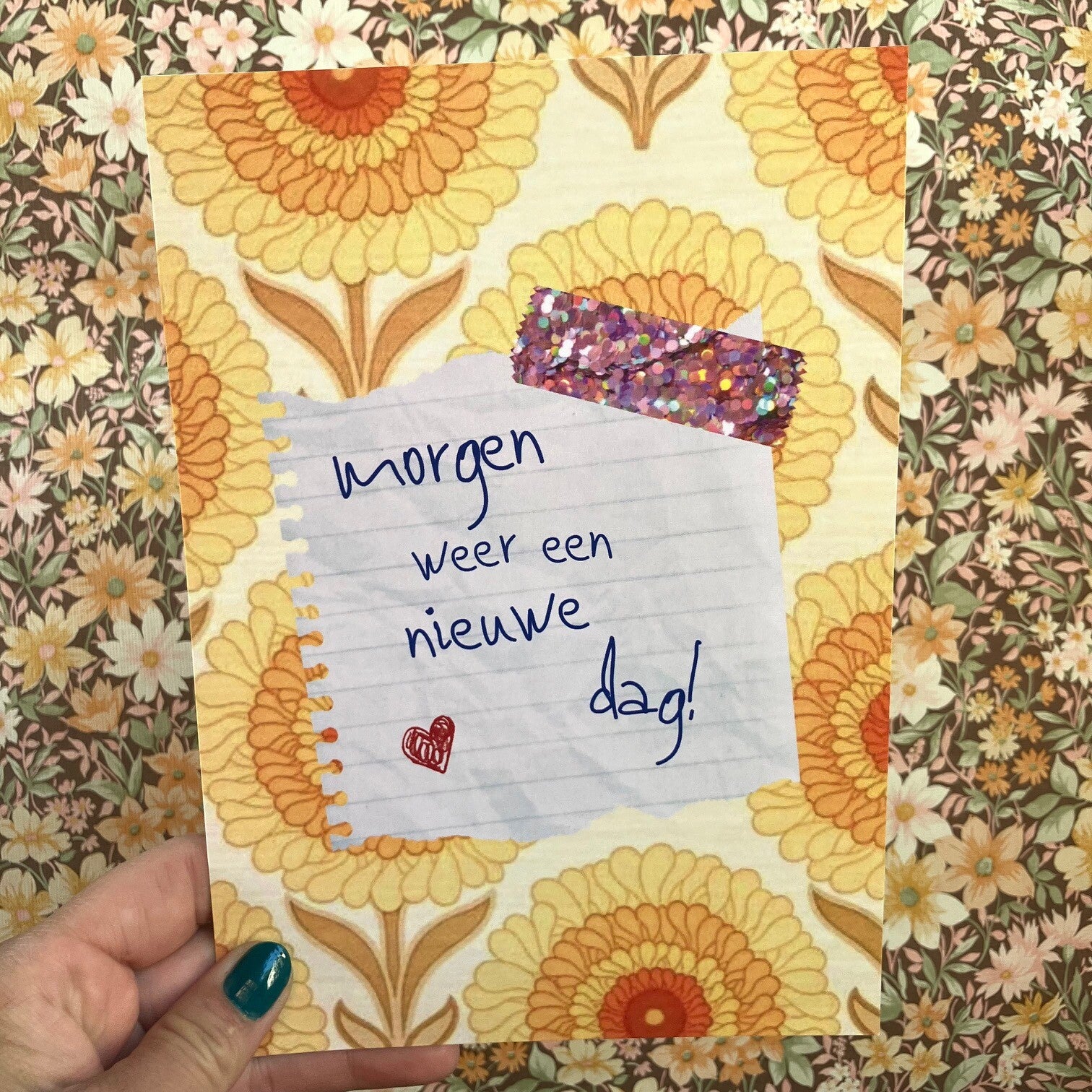 Leuke print met de tekst "Morgen weer een nieuwe dag". De kaart met een vintage behangetje als achtergrond heeft een matte uitstraling.