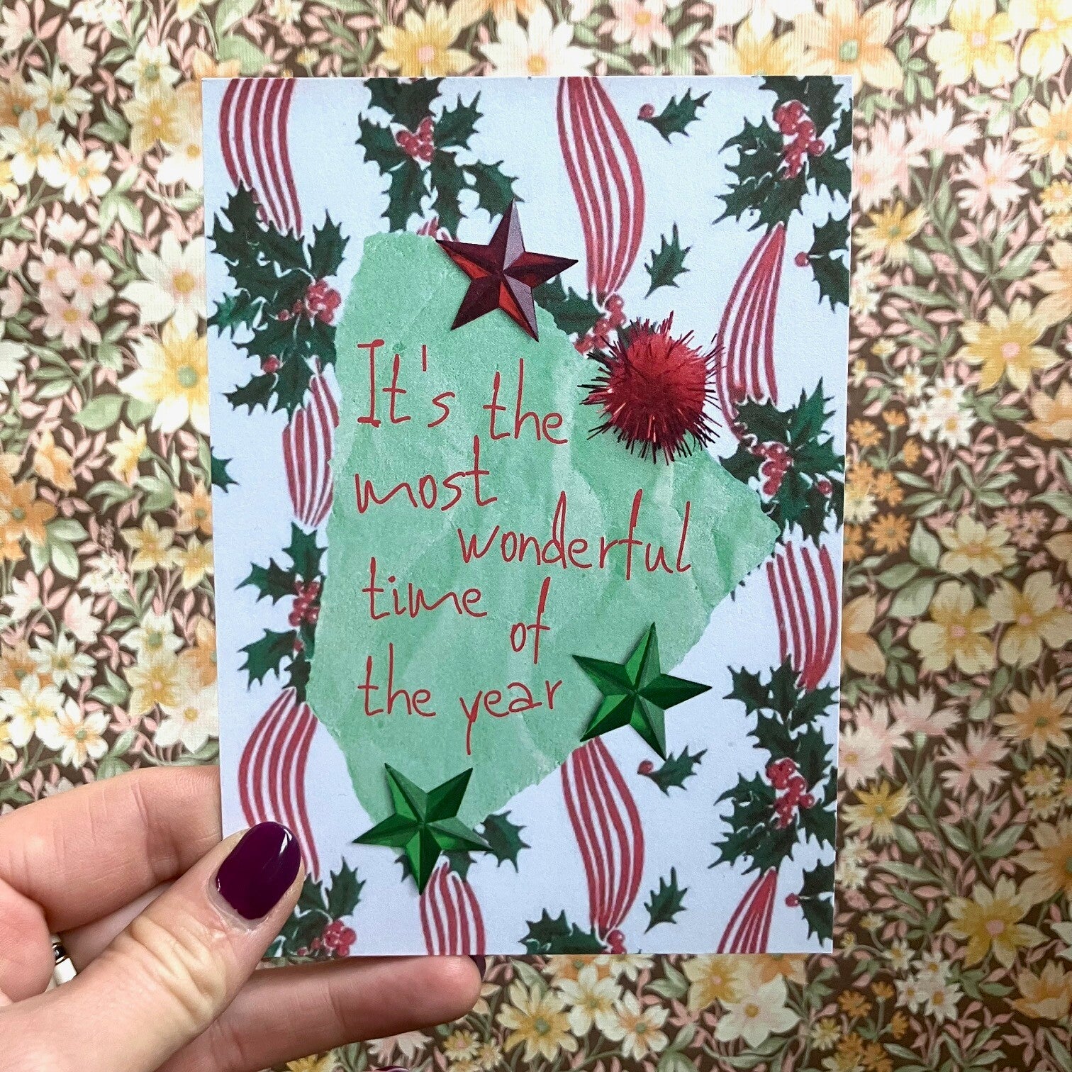 Leuke kerstkaart met de tekst "It's the moste wonderful time of the year". De kaart met een vintage behangetje als achtergrond heeft een matte uitstraling.A6 formaat400 grams ongestreken papier