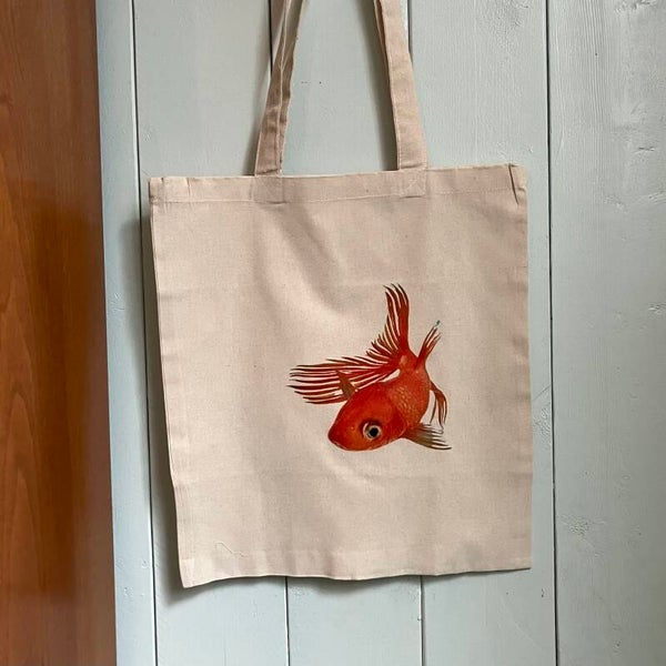 Leuke canvas tas met print. De tas heeft als afbeelding een met olieverf geschilderde goudvis.
